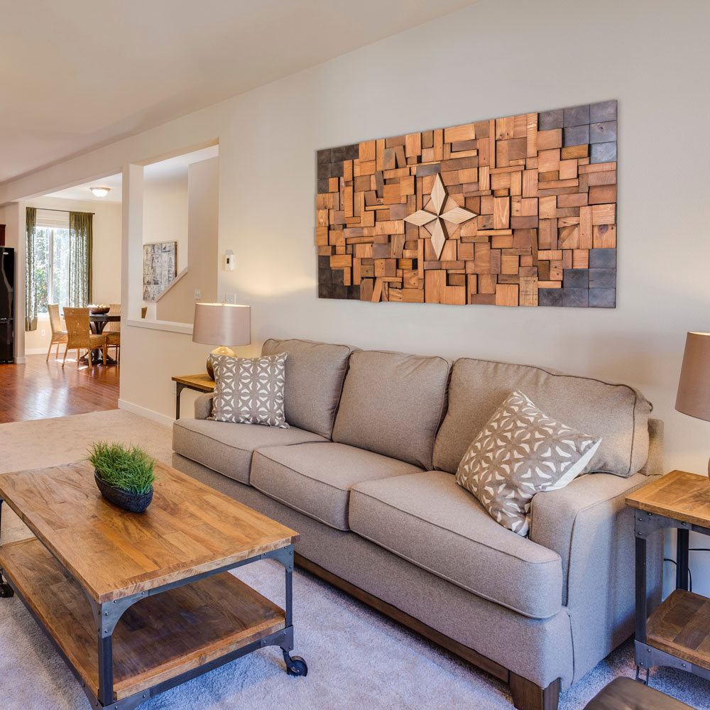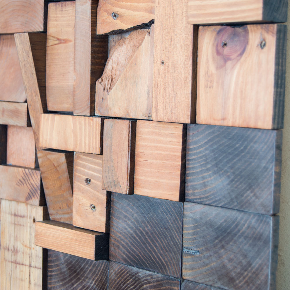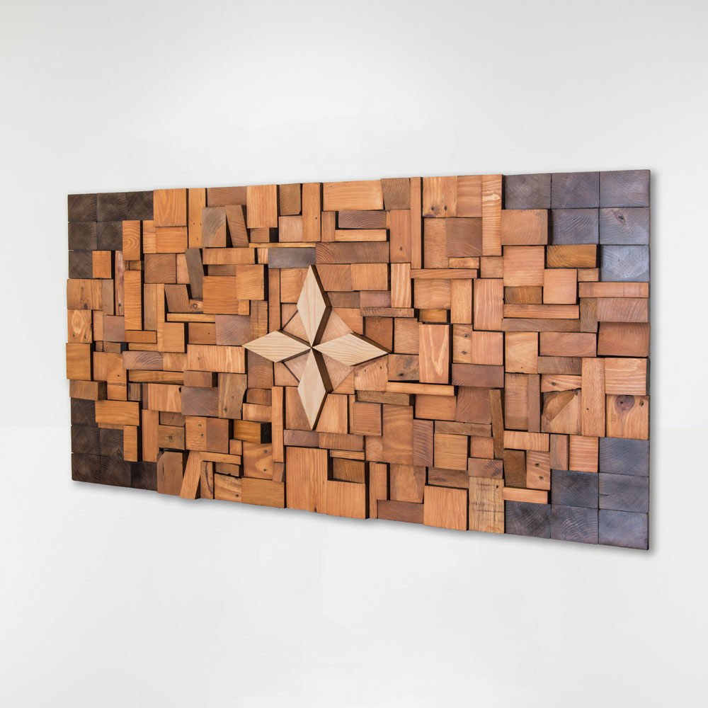 This elegant wall decor is made from reclaimed wood and painted with natural stains: walnut in the corners and oak inside. To protect and embellish the work I apply natural wax. The wood that occupies the central star shows its own natural color and is protected with water-based varnish.