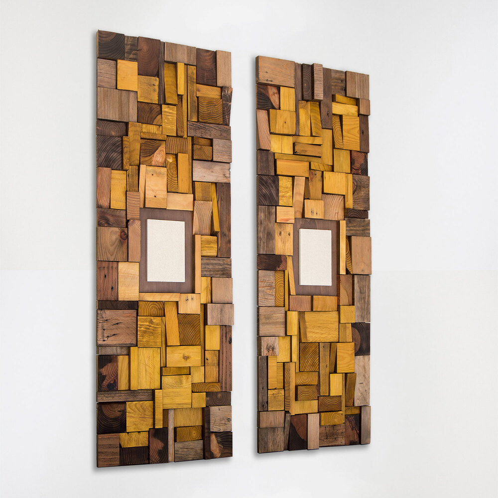 To create this set of 2 wood wall art, I cut and sand the pieces one by one to highlight the beauty of their grain and appreciate their softness to the touch. I select the pieces for their texture and beautiful imperfections. The artwork is oriented vertically and they have different shades of color: the outer part is darker and has wenge color, the interior combines oak and chestnut tones. The central part is a light beige rectangle that brings a unique and very modern character. I have applied natural waxes and olive oil to protect and beautify the work.